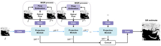 - Haris, M.; Shakhnarovich, G.; Ukita, N. Recurrent Back-Projection Network for Video Super-Resolution. In Proceedings of the 2019 IEEE/CVF Conference on Computer Vision and Pattern Recognition (CVPR), Long Beach, CA, USA, 14–20 June 2019; pp. 3892–3901. [Google Scholar]