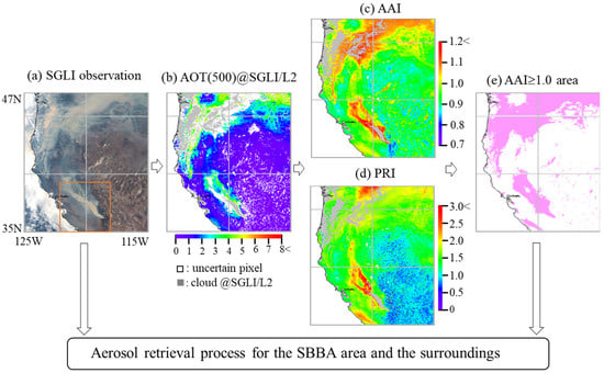 Diagram showing the pre-selection process of SBBA candidate pixels before the main BBA retrieval using GCOM-C/SGLI observations over western North America on 13 September 2020. (a) Color composite image from SGLI data, (b) distribution of AOT (500) from SGLI/L2, (c) distribution of index AAI from SGLI data, (d) same as (c) but for index PRI and (e) the area with AAI ≥ 1.1 is colored by pink. BBA: biomass-burning aerosol; SBBA: severe BBA; SGLI: second-generation global imager; AOT: aerosol optical thickness; AAI: absorbing aerosol index; PRI: polarized radiance index.