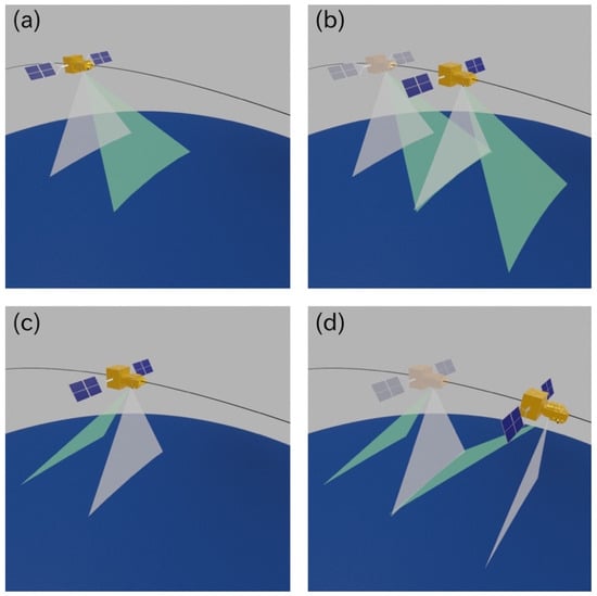 SGLI’s two-directional image acquisition. White triangles show the lines of sight of radiance-only optics, and the green triangles show the lines of slightly tilted polarization optics. (a) Northern Hemisphere configuration; (b) same as (a) but approximately 2 min later; (c) Southern Hemisphere configuration; (d) same as (c) but approximately 2 min later. SGLI: second-generation global imager.