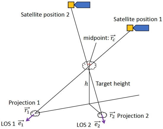Figure 3 shows a schematic of the target position estimation from a pair of ground projections: Projections 1 and 2. The positions of projections and , as well as the measurement line-of-sight (LOS) vectors and , were obtained from the geometry information of the SGLI Level 1B product. In theory, two LOSs intersect at the target position; however, errors in the geometric information and feature matching often separate them by a distance up to the spatial resolution of the image. Therefore, we selected the midpoint of the line that joined the two LOSs at the minimum distance as the best estimate of the target position. The midpoint position was computed using the following equation: