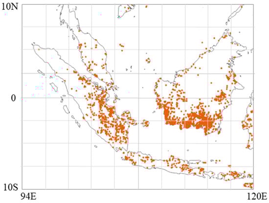 Figure 4 shows the accumulated hotspot map for September 2019, derived from the MODIS Level 2 Thermal Anomalies/Fire product (MOD14, Collection 6) [31]. Hereafter, equal longitude and latitude projections were used for the presented maps. Figure 4 shows that Indonesia experienced several large-scale wildfires in September 2019, particularly in Sumatra and southern Kalimantan.