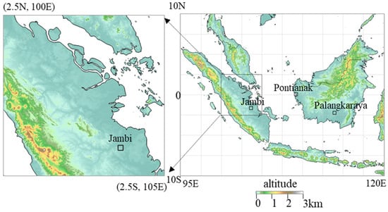 Figure 5 shows a topographic map of Indonesia. The small black squares denote AERONET stations (Jambi, Pontianak, and Palangkaraya). The intense wildfire area near the Jambi station is represented by a black square and is further expanded on the left side of the figure. The topographic information of the area shows that the fire was not in the alpine forest but at a height of several hundred meters. This implies that the observed hotspots near the Jambi station are likely well-known peatland fires [30].