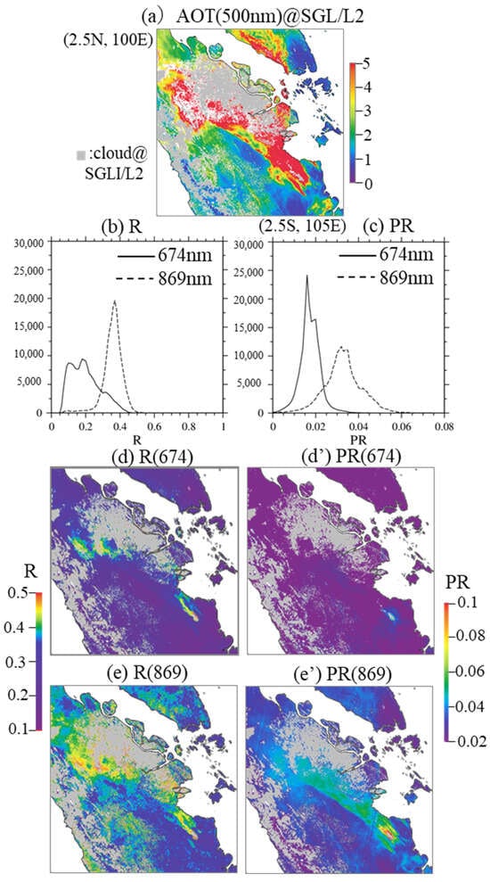 SGLI measurements over Sumatra on 21 September 2019. (a) AOT (500 nm) from SGLI/L2 products; (b) frequency histogram of the R in Figure 6a at wavelengths of 674 and 869 nm; (c) the same as Figure 7b, but for PR; (d) distribution of R and PR images, respectively, at 674 nm; (e,e’) the same as (d,d’) but for 869 nm. AOT: aerosol optical thickness; SGLI: second-generation global imager; R: radiance; PR: polarized radiance.