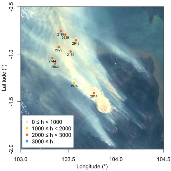The plume height was estimated by the method described in Section 2.2 from the two-directional data acquired, as shown in Figure 2. Focusing on the fire source of the Sumatra wildfire on 21 September, 2019, the estimated plume height values according to Equations (1)–(3) are presented in Figure 8.