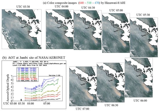 Sequential measurements over North Sumatra on 21 September, 2019. (a) Color composite images observed by Himawari-8/AHI, (b) AOT measured at Jambi site of NASA/AERONET. AOT: aerosol optical thickness; NASA: National Aeronautics and Space Administration; AERONET: aerosol robotic network.