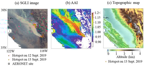 Forest fires in California observed by SGLI at 18:47 UT on 13 September, 2020. (a) Color composite image: (R, G, B) = (674, 530, 443 nm) with hotspots on 12 and 13 September from MODIS Level 2 Thermal Anomalies/Fire product (MOD14) and AERONET site; (b) AAI distribution; (c) topographic map with hotspots on 13 September, where SGLI: second-generation global imager; MODIS: moderate-resolution imaging spectroradiometer; AERONET: aerosol robotic network; AAI: absorbing aerosol index.