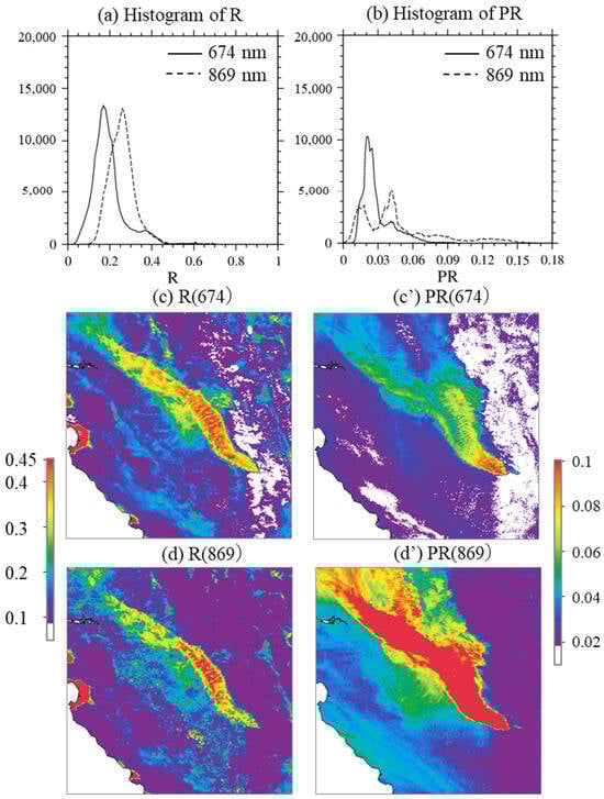 SGLI measurements over the west coast of North America on 13 September 2020. (a) Frequency histogram of R at 674 nm and 869 nm wavelengths; (b) the same as Figure 12a but for PR; (c) distribution of R at 674 nm; (c’) distribution of PR at 674 nm; (d) distribution of R at 879 nm; (d’) distribution of PR at 869 nm. SGLI: second-generation global imager; R: radiance; PR: polarized radiance.
