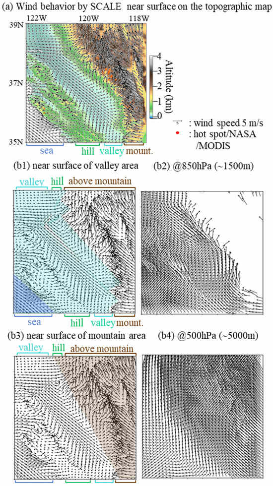 Wind field at the resolution of 5 × 5 km at 19:00 (UT) on 13 September, 2020, used in SCALE. (a) Near the surface superposed on the topographic map; (b1) (light blue area) near valley surface; (b2) at 850 hPa (~1500 m); (b3) (light brown area) near the surface of the mountain; (b4) at 500 hPa (~5000 m). MODIS: moderate-resolution imaging spectroradiometer; NASA: National Aeronautics and Space Administration; SCALE: Scalable Computing for Advanced Library and Environment.