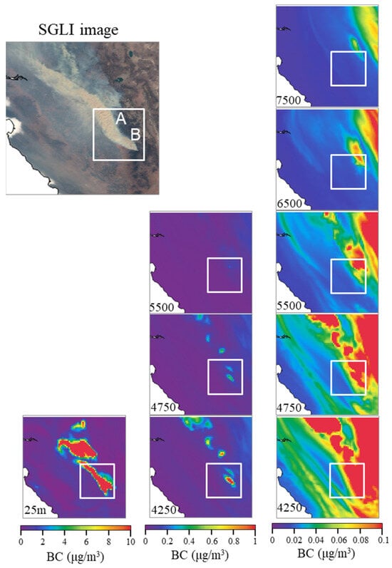 With the complex wind field presented in Figure 13, the BC concentration (μg/m3) was simulated using the CTM. Figure 15 shows the BC concentrations near the surface and at high altitudes at the three different scales. The plume between points A and B, where the stereoscopic method estimated the greatest plume height (Figure 14), is indicated by a small white square in each figure. The air mass spreads northwestward as it moves higher in the atmosphere, reflecting the wind behavior shown in Figure 13. The CTM simulation also showed a distribution of BC high-concentration areas, corresponding to the plume observed in the SGLI image. However, at the plume altitudes estimated from the two-directional SGLI data, the simulated BC concentrations were much lower. In any case, the improved reproducibility of the vertical profiles should be considered when simulating aerosol plumes from large forest fires using the CTM.