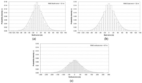A comparison of the empirical data of the GPS error in the directions of N-S (a), E-W (b), and h (c) with the theoretical normal distribution [17].