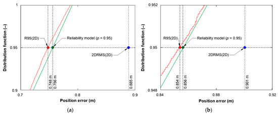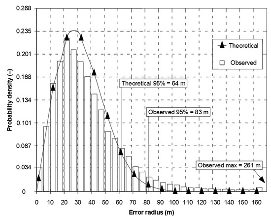 The differences in φ and λ error distributions in relation to normal distributions, presented in Figure 1a,b, undoubtedly lead to considerable differences in the consistency between the 2D position error and the chi-squared distribution, which is a commonly applied 2D position error distribution model for navigation systems [6,18]. The document [16] analysed the 2D position error that was determined in two ways (Figure 2). The theoretical value (83 m, p = 0.95) was calculated based on the 2DRMS measure (assuming that the normal distribution of φ and λ errors), while the empirical value (64 m, p = 0.95) was determined when searching for such an error value from which 95% fixes would be greater (R95 measure). It should be stressed that the difference in the same quantity (position error at p = 0.95), calculated by two different methods, amounted to 19 m. Hence, it is difficult to agree with the view that the application of the 2DRMS measure to assess the navigation positioning system accuracy is correct [17].