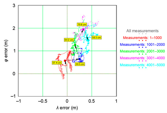 The main session tests demonstrated that the statistical distributions beta, logistic, lognormal, normal, and Student’s t best approximated φ errors (GPS 1 receiver), while the distributions beta, gamma, logistic, lognormal, and normal best described λ errors (GPS 1 receiver). What is more, based on the data recorded during the main session, it can be concluded that [22]: