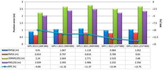 - The 2DRMS measure value was underestimated by 10–14% in relation to the R95 measure value that should be considered the actual value. Similar differences between the 2DRMS measure and the R95 measure are presented in [39,40];