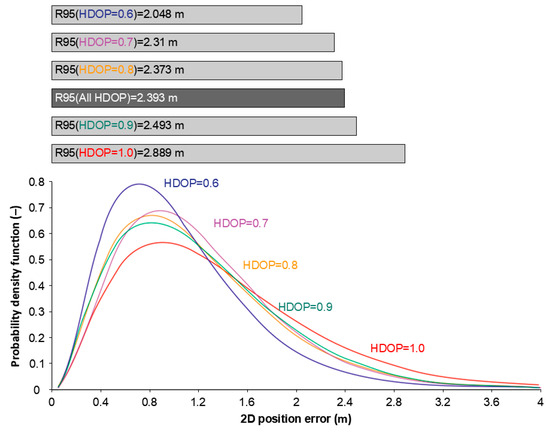 GPS 2D position error PDFs for specific HDOP values in the range from 0.6 to 1.0 and the R95 measure values calculated for the selected HDOP values [23].