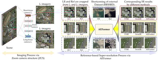 The proposed method follows the process of ‘imaging then super-resolving’, which refers to the design of zoom camera structure (ZCS) and the proposed RefSR network, namely AEFormer.