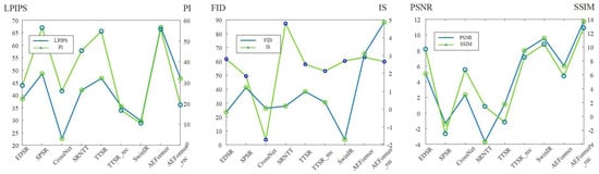 where Hl and Wl represent the height and width of l-th layer. and indicate the features at the specific location (h, w) of l-th layer from the generated image and the ground truth image. wl is a supervised weight vector. ⊙ denotes elementwise multiply. Tr(∙) represents the sum of elements on the diagonal of a matrix. PI, as the non-reference metrics, can be calculated by incorporating the criteria of Ma [67] and NIQE [65]. It indicates the perception quality of the generated image. More details in the generated image can lead to a better PI result, which is lower in score. In FID equation, the distance between these two univariate Gaussian distributions is calculated using mean and variance, in which r denotes the ground-truth image, while g denotes the generated image. A lower FID means that the two distributions are closer, which means that the quality and diversity of the generated images are higher. Lastly, in IS equation, the conditional probability P(y|x) is expected to be highly predictable (low entropy) for GAN. For example, given an image, the object type should be known easily. In turn, an Inception network is used to classify the generated images and predict P(y|x), where y is the label and x is the generated data. This reflects the quality of the images. Besides, if the generated images are diverse, the data distribution for y should be uniform (high entropy) [64]. Finally, to combine these two criteria (quality and diversity), their KL-divergence can be computed and the equation can be used to obtain IS score. Based on previous knowledge [63] and experimental results below, the biggest difference between FID and IS is that FID focuses more on image similarity, while IS focuses more on data diversity especially for GAN methods.