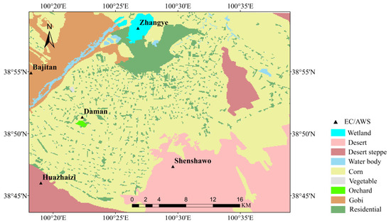 The study area contains five long-term continuous observations, i.e., Daman, Zhangye, Huazhaizi, Shenshawo, and Bajitan. The underlying surfaces of these five sites are corn, wetland, desert steppe, desert, and Gobi, respectively. The field observation system of the HiWATER (Heihe Watershed Allied Telemetry Experimental Research) mainly includes an automatic weather station (AWS), and an eddy covariance (EC) (https://data.tpdc.ac.cn/en) (accessed on 11 October 2022) [26].
