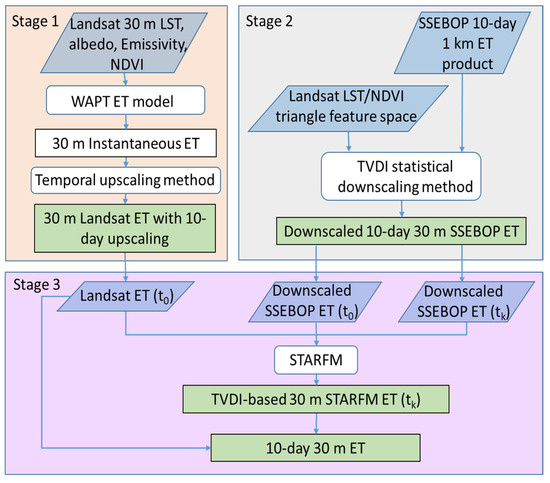 Schematic overview of the inputs and processing in the STAEDM framework. (Note: is a 10-day period including the Landsat instantaneous over-pass time, is a 10-day period excluding the Landsat instantaneous over-pass time).