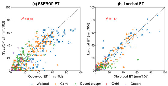 Comparison of remote sensing estimated ET data and observed ET at the five sites with difference land covers during 2013 to 2018. (a) SSEBOP ET and (b) Landsat ET.