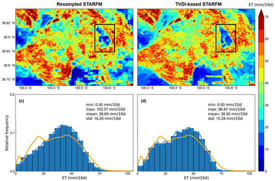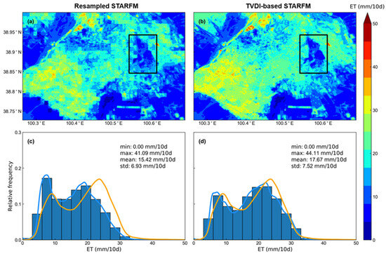 Spatial pattern of ET maps in the 2nd dekad of September 2016 from (a) resampled STARFM, and (b) TVDI-based STARFM models. And frequency distribution curves of ET maps from (c) resampled STARFM, and (d) TVDI-based STARFM models are colored by blue. The frequency distribution curves of ET maps from Landsat are colored by orange. The ET is predicted by the Landsat/SSEBOP ET pairs in the 1st dekad of October 2016. The black rectangle in (a) is magnified in Figure 8e, and the black rectangle in (b) is magnified in Figure 8f.