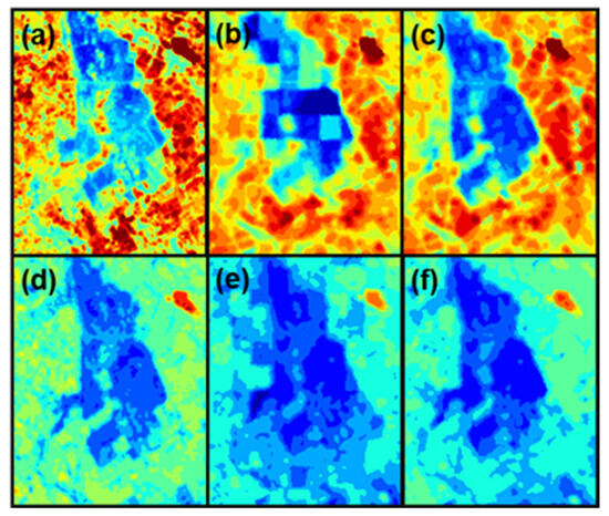 Magnified view of ET in different dates. (a,d) from Landsat ET, (b,e) from the resampled STARFM model, and (c,f) from the TVDI-based STARFM model. (a–c) in the 3rd dekad of June and (d–f) on the 2nd dekad of September 2016.