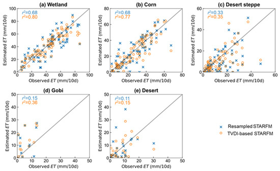 Overall, the performance of TVDI-based STARFM ET was better than resampled STARFM ET for all underlying surfaces. The ET estimated by TVDI-based STARFM was more closely matched to the observations (1:1 line) than that of resampled STARFM (Figure 9). For example, the r2 value in the wetland for TVDI-based STARFM ET was higher than resampled STARFM (0.80 compared with 0.68, Figure 9a). This is because of the consideration of underlying surface parameters (TVDI) for the TVDI-based STARFM model. Resampled STARFM directly uses resampled SSEBOP data as the input, which makes it difficult to reflect the ET characteristics of wet and arid underlying surfaces. Compared to resampled STARFM, the TVDI-based STARFM model could better capture the ET differences among various underlying surfaces.