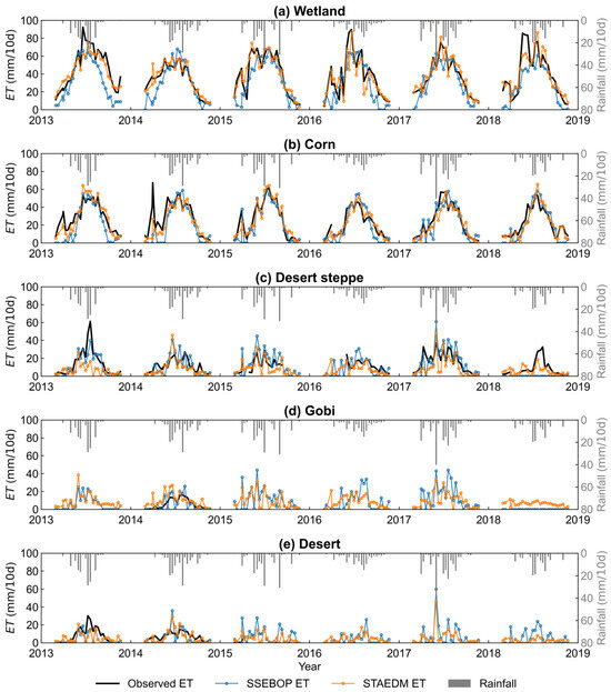 In non-vegetable surfaces, the seasonal variation of ET is mainly influenced by precipitation. When there is no rainfall, the ET value is very low, usually less than 10 mm/10 d (Figure 11). With rainfall, both SSEBOP and STAEDM ET values increase sharply. The increase of STAEDM ET is similar to the variation of observations. Note that the rainfall data from the corn station was applied to the five sites due to the limited size of the study area and the discontinuity of rainfall data from other stations.