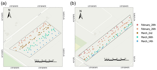 Wine grapes were manually harvested between 20 February and 14 March 2023 (from veraison to harvest time). Three berries from a single bunch were randomly selected from each sampling vine. Table 2 shows the number of sampling vines from each measurement date. During each measurement, the location of the sampling vine’s trunk was recorded by a global navigation satellite system (GNSS) with real-time kinematic (RTK) correction (model: GPS1200+, Leica Geosystems AG., Heerbrugg, Switzerland). Figure 1 shows the sampling locations in each vineyard. After acquiring grape berries, total soluble solids (TSS) expressed in °Brix, was chosen as a proxy for grape sugar content and measured by using a portable digital refractometer (PAL-ALPHA Digital Refractometer, ATAGO CO., LTD, Tokyo, Japan). The sugar content of each sampling vine was determined by calculating the mean of the three measurements taken per sampled vine. The weather during collecting samples period is shown in Figure 2.