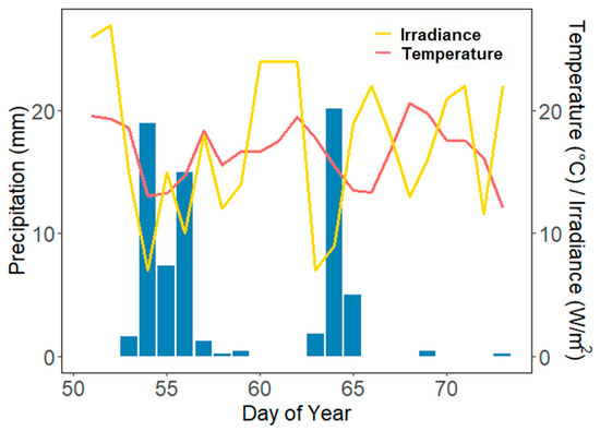 Total daily precipitation, average temperature, and irradiance recorded by on-site weather station (blue bar represents the precipitation).