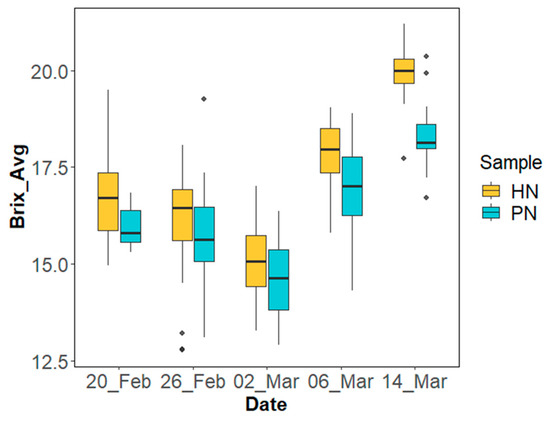 In this study, we explored the potential to use VIs, soil ECa, elevation, slope, and TC data as input variables to predict the grape sugar content in a non-destructive way. A total of 236 samples from Pinot Noir cultivars had the TSS measured values based on destructive methods from two commercial vineyards and used as output variable in the regression model. The grape TSS was measured on five different days in the period from veraison to harvest. During the veraison stage, the berries start to mature changing color, softening, accumulating sugar, and reducing acid [37]. From veraison, grape growers start to measure the grape quality parameters such as TSS, pH, and titratable acidity in order to determine the best harvest day. Among them, the TSS is an important parameter to assess the grape maturity as it can determine the alcohol concentration and flavor of the subsequent wine. Figure 4 shows that the sugar content of grapes initially decreased and then increased during the study period. However, in a previous study, the sugar concentration of grapes exhibited a strong increase starting from veraison and eventually reached a plateau during harvest stage [38]. One possible reason is that the sampling vines were randomly selected during each of the five-measurement days, without repeating the selection. This differed from the sampling strategy used in the previous study. Several studies have shown that there is considerable spatial and temporal variation in grape TSS [2,39]. Thus, the grapes in different geographic locations may accumulate sugar at different rates [2]. On each measurement day, the large magnitude of the interquartile range and the outlier in Figure 4 showed the large spatial variability in grape TSS within the vineyard blocks. Thus, it is inappropriate to take a single or average measurements, collected in the vineyard to represent the grape maturity stage.