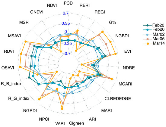 Pearson’s correlation coefficient between VIs and grape TSS (Different colors represent different sampling date).