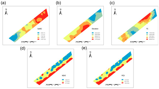Spatial interpolation map of soil ECa (a); elevation (b); trunk circumference (c); NDVI (d); PCD (e) in HN vineyard.