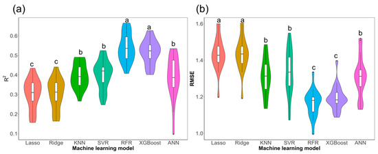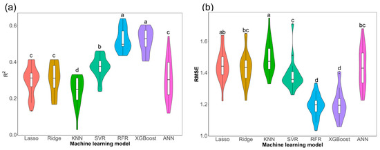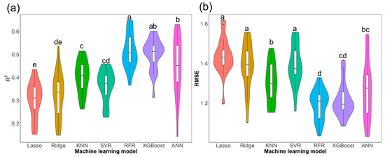 The boxplot of different machine learning model performance in R2 (a); RMSE (b). (Different letters between any two groups represents significant difference between them, if two groups have the same letter then this indicates that they are not statistically different).