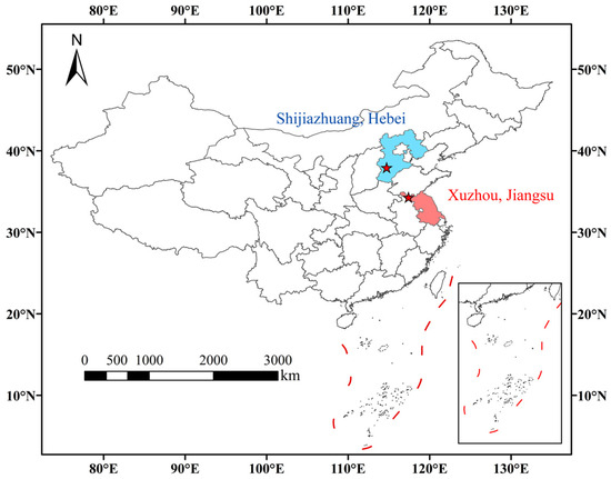 In this study, selection trials of soybean varieties were conducted in two different climatic regions, Shijiazhuang City (SJZ) and Xuzhou City (XZ), from June to October 2022 (Figure 1). The SJZ site (E114°43′28″, N37°56′27″), with a total area of about 8000 m2, is located in Hebei Province, with a temperate continental monsoon climate. The XZ site (E117°24′07″, N34°17′50″) with a total area of about 8000 m2 is located in Jiangsu Province, with a warm–temperate semi-humid monsoon climate.