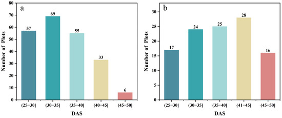 In this study, in situ field observations and records of the phenological development and IADAS were conducted for each plot at an interval of 2 days, following the specifications for agrometeorological observations of soybean (https://www.cma.gov.cn/zfxxgk/gknr/flfgbz/bz/202209/t20220921_5099037.html, accessed on 12 June 2022) from the China Meteorological Administration. The phenological time was recorded in terms of DAS. When the number of flowering plants in a plot was observed to be up to 10% of the total plants in that plot, the exact date was recorded as the soybean IADAS of this plot.