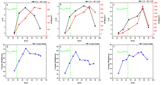 Overall, the LAI, AGB and CH of early, middle and late IADAS varieties all showed an obvious trend of first increasing and then decreasing. This trend is consistent with the characteristics of nutrient uptake and the growth of soybean plants. The general changing trend of LAI, AGB and CH was similar in the two trials. Note that there was a decrease in the canopy height in Figure 3d,e. This was because these soybean varieties suffered lodging around DAS 45, which led to a decreased canopy height.