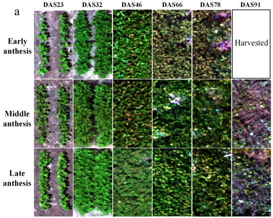 The SJZ experiment was conducted from 17 July to 12 October, and the XZ experiment was conducted from 29 June to 28 September, with 17 and 21 multispectral image acquisition missions, respectively. DJI Terra software was used for image stitching and radiometric calibration, and ArcMap software version 10.2 (Environmental Systems Research Institute, Inc., Redlands, CA, USA) and ENVI software version 5.3 (Harris Geospatial Solutions, Inc., Boulder, CO, USA) were used for image-cropping, band alignment, plotting the region of interest (ROI) with the same location for each date, and extracting the average reflectance of the pixels within the ROI.