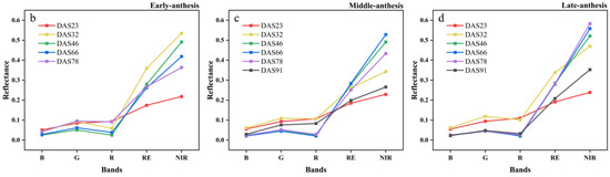 The canopy multispectral images of the soybean varieties with early, middle and late IADAS are shown in Figure 4a, and the canopy reflectance of the five bands at different growth stages are shown in Figure 4b–d. Overall, with the development of the soybean growth, the reflectance of the five spectral bands showed a trend of first increasing and then decreasing, especially in the red-edge and near-infrared bands. With the delayed IADAS of soybean varieties, the spectral reflectance was significantly different among the soybean canopies with early, middle and late IADAS, and there was a significant gradual increase in the reflectance of the red-edge and near-infrared bands.