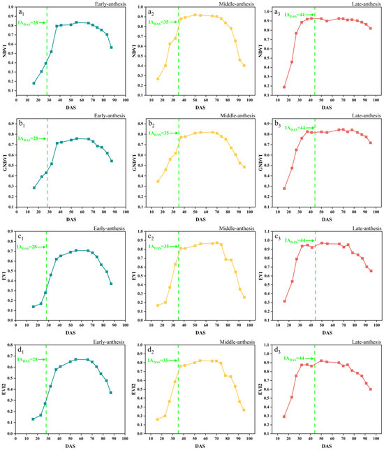 The time-series dynamic changes in the NDVI, GNDVI, EVI, EVI2, and NDRE are shown in Figure 5, in which the early, middle and late anthesis varieties of SJZ are presented as an example and the green dotted lines indicate the IADAS of each variety, respectively. It can be seen that these vegetation indices changed similarly, with an initial increase followed by a decrease, aligning with the typical growth dynamics of vegetation. After soybean emergence, NDVI, GNDVI, EVI, EVI2, and NDRE rapidly increased, and reached their maximum around DAS 40. Subsequently, NDVI and GNDVI remained stable between DAS 40 and 80, with values close to 0.9 and 0.8, respectively. EVI and EVI2 also stayed near 0.9 from DAS 35–75, while NDRE remained at approximately 0.3 from DAS 50–75. When this entered the maturity stage around DAS 80, all five indices showed a rapid decline. For a wide variety of soybean materials, like early, middle, and late flowering varieties, the spectral curves of these five indices became saturated at different time positions, like before, after, and near anthesis (near DAS 40), making it difficult to extract consistent features from them to monitor the soybean IADAS.