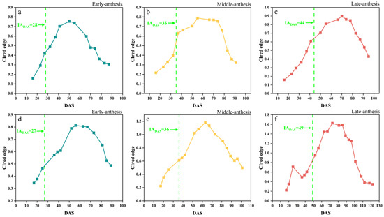 CIred edge time-series curves: (a) SJZ early-anthesis varieties; (b) SJZ middle-anthesis varieties; (c) SJZ late-anthesis varieties; (d) XZ early-anthesis varieties; (e) XZ middle-anthesis varieties; (f) XZ late-anthesis varieties.