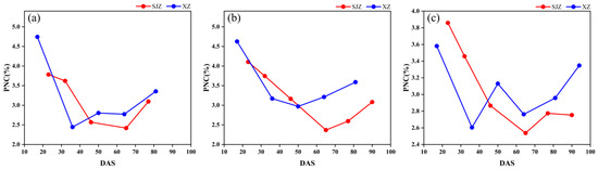 In addition, the peak values of the CIred edge in the SJZ trial were generally found to be greater than those in the XZ trial (Figure 6). As the CIred edge has been shown to be an accurate measure of chlorophyll [51,52] and there is a high positive correlation between chlorophyll content and nitrogen content [53], the plant nitrogen content (PNC) measured in the two trial sites is shown in Figure 7 to clarify this point. The results showed that the PNC of soybean in the XZ site was higher than that in the SJZ site from Days 50 to 80, which may be the factor that results in the higher CIred edge peak in the XZ site. Furthermore, some noise appeared in the time-series of the CIred edge, as shown in Figure 6e,f. This is inevitable in the field data collection; hence, smoothing and fitting methods are needed to reconstruct the time-series curves of VIs, as mentioned earlier.