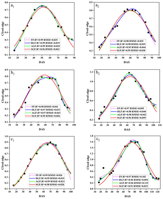 Fitted CIred edge curves: (a1) SJZ early-anthesis varieties; (b1) SJZ middle-anthesis varieties; (c1) SJZ late-anthesis varieties; (a2) XZ early-anthesis varieties; (b2) XZ middle-anthesis varieties; (c2) XZ late-anthesis varieties.