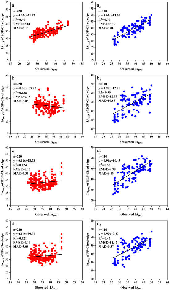 Relationships between the measured IADAS and the estimated IADAS with the FDmax of the CIred edge curves fitted by SGF, AGF, DLF and FF functions: (a1) SJZ: measured IADAS and estimated IADAS from the FDmax of SGF_CIred edge; (a2) XZ: measured IADAS and estimated IADAS from the FDmax of SGF_CIred edge; (b1) SJZ: measured IADAS and estimated IADAS from the FDmax of AGF_CIred edge; (b2) XZ: measured IADAS and estimated IADAS from the FDmax of AGF_CIred edge; (c1) SJZ: measured IADAS and estimated IADAS from the FDmax of DLF_CIred edge; (c2) XZ: measured IADAS and estimated IADAS from the FDmax of DLF_CIred edge; (d1) SJZ: measured IADAS and estimated IADAS from the FDmax of FF_CIred edge; (d2) XZ: measured IADAS and estimated IADAS from the FDmax of FF_CIred edge.