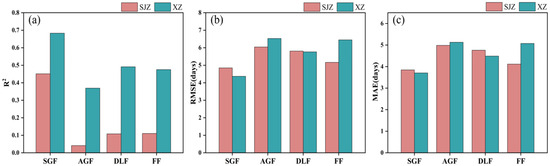 It was shown that the RT50 of the SGF_CIred edge phenology curve demonstrated the best recognition accuracy in both SJZ and XZ sites, with an R2 of 0.451 and 0.683, RMSE of 4.85 and 4.37 days, and MAE values of 3.81 and 3.71 days, respectively. The accuracy of the IADAS estimated using the RT50 from the DLF_CIred edge and FF_CIred edge curves was comparable: in the SJZ site, the results from the FF_CIred edge curve (RMSE = 5.16 days, MAE = 4.12 days) were slightly better than those of the DLF_Cired edge curve (RMSE = 5.81 days, MAE = 4.76 days), while, in the XZ site, the accuracy from the DLF_CIred edge curve (RMSE = 5.76 days, MAE = 4.49 days) was slightly higher than that of the FF_CIred edge curve (RMSE = 6.45 days, MAE = 5.07 days). The identification accuracy of IADAS with the RT50 from the AGF_CIred edge was lower compared with that of the above-mentioned three curves, with an R2 of 0.041 and 0.369, RMSE greater than 6 days, and MAE greater than 5 days for the SJZ and XZ sites.