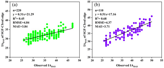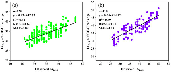 Relationships between the measured IADAS and the estimated IADAS with the RT50 of the SGF_CIred edge curve: (a) SJZ; (b) XZ.