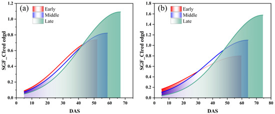 Area under the SGF_CIred edge curve from the starting to the peak for early, middle and late anthesis varieties of soybean: (a) SJZ; (b) XZ.