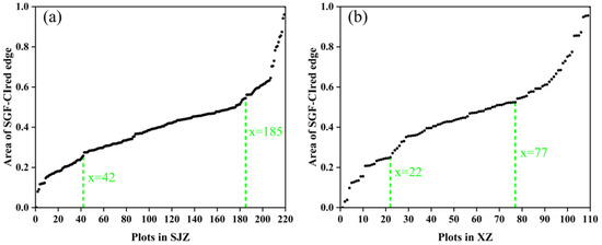The SGF_CIred edge curve, which showed the best performance in IADAS identification according to the above results, was used here to group the soybean varieties into early, middle, and late anthesis categories. It was found that the area under the SGF_CIred edge curve, from the starting point to the peak, can be used as an effective indicator to divide the varieties into early, middle and late anthesis groups, as shown in Figure 12. Additionally, the area values, which were normalized and sorted in ascending order, are presented in Figure 13. It was shown that the distribution of the area points was uniform and continuous between the locations of 42 and 185 for the SJZ trial, and between locations 22 and 77 for the XZ trial. Therefore, for the SJZ and XZ trials, the top 42 and 22 in the area rankings were grouped as early-anthesis varieties, 43–185 and 78–110 were grouped as middle-anthesis varieties, and 186–220 and 78–110 were grouped as the late-anthesis varieties, respectively.