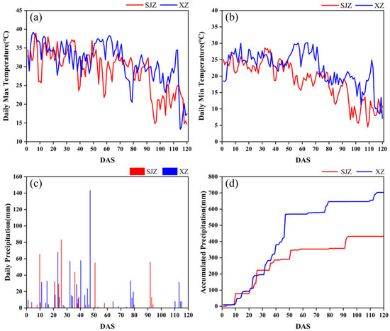 Comparison of temperature and precipitation conditions between XZ and SJZ regions: (a) daily maximum temperature; (b) daily minimum temperature; (c) daily precipitation; (d) cumulative daily precipitation.