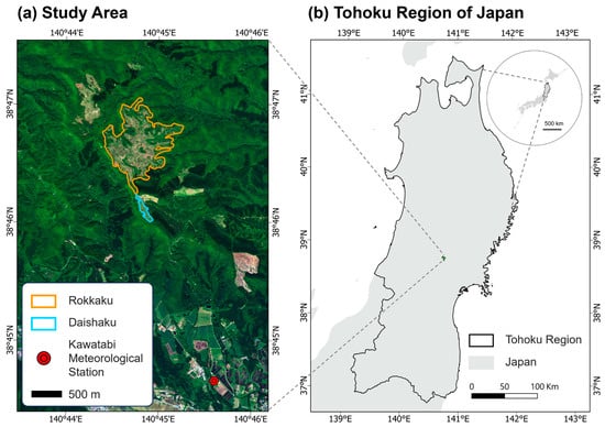 Geographic position of the study area. (a) True-color RGB (R: band 5; G: band 3; B: band 2) visualization of the study area as captured by the WorldView-2 satellite on May 26, 2018. The pasture outlined by the yellow line signifies the Rokkaku pasture, the blue line represents the Daishaku pasture, and the red circle indicates the location of Kawatabi Meteorological Station. (b) The specific location of the study area within the Tohoku region of Japan.