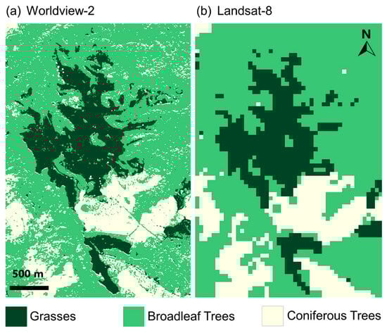 Vegetation classification maps derived from (a) WorldView-2 and (b) Landsat-8, both captured on 26 May 2018. The classifications are divided into three categories: grasses, broadleaf trees, and coniferous trees.